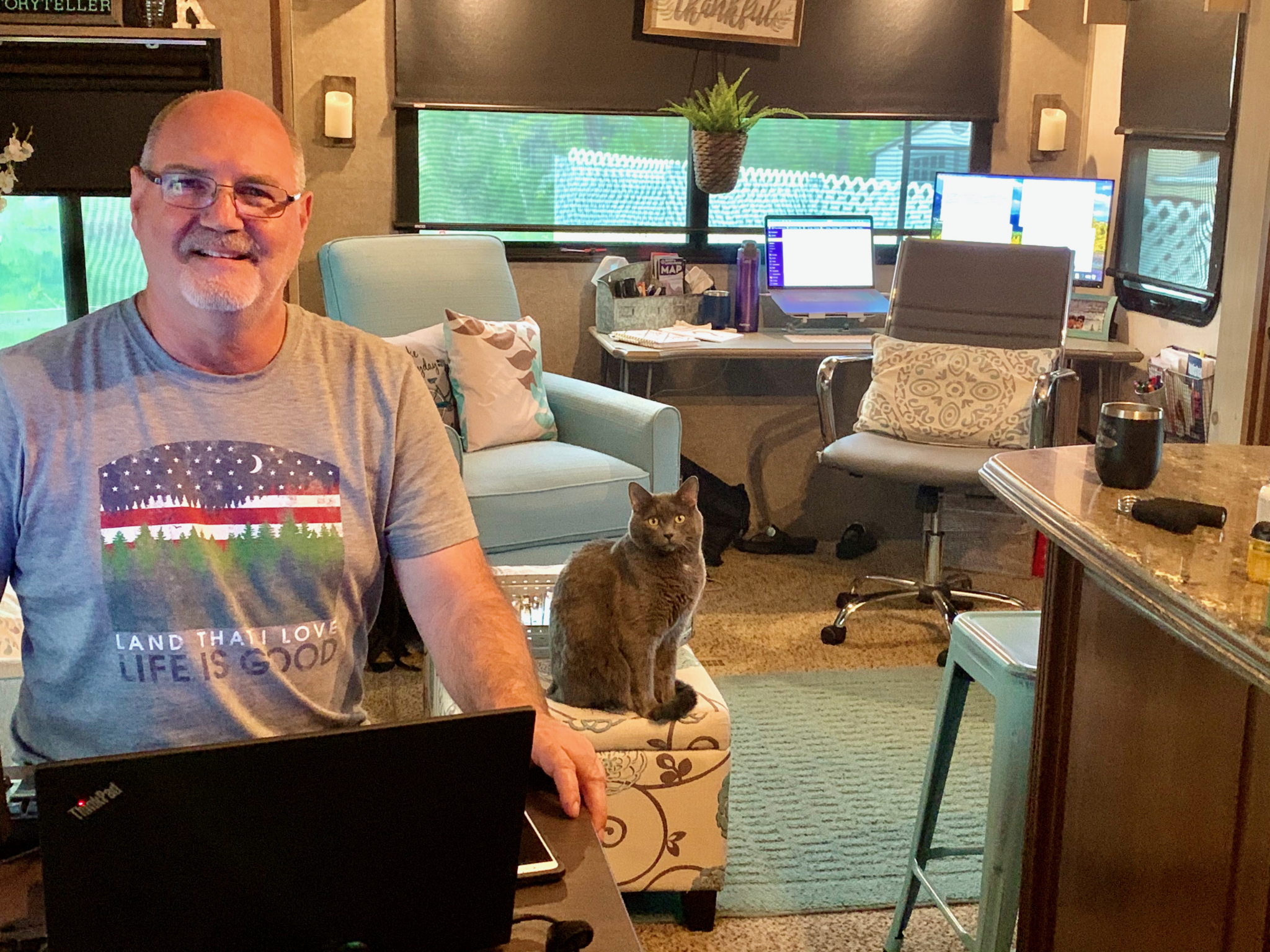 - Personalize your space. Even if that’s only temporary for the next few weeks or more. Set up your computer (if it’s for remote working) and if you are able to bring your monitor & keyboard from your office that is ideal to mimic a normal work day. Is there a favorite photo or item that gives you comfort at work or makes it easier to get through the day? If so, bring it home too. In our situation, Craig was recently going into an office while I continued to work from the RV. Now it is mandatory for him to work from home (like it was for us in the past) so he set up his monitor and keyboard on our dining table and I use the desk and we make the space suit our individual needs.