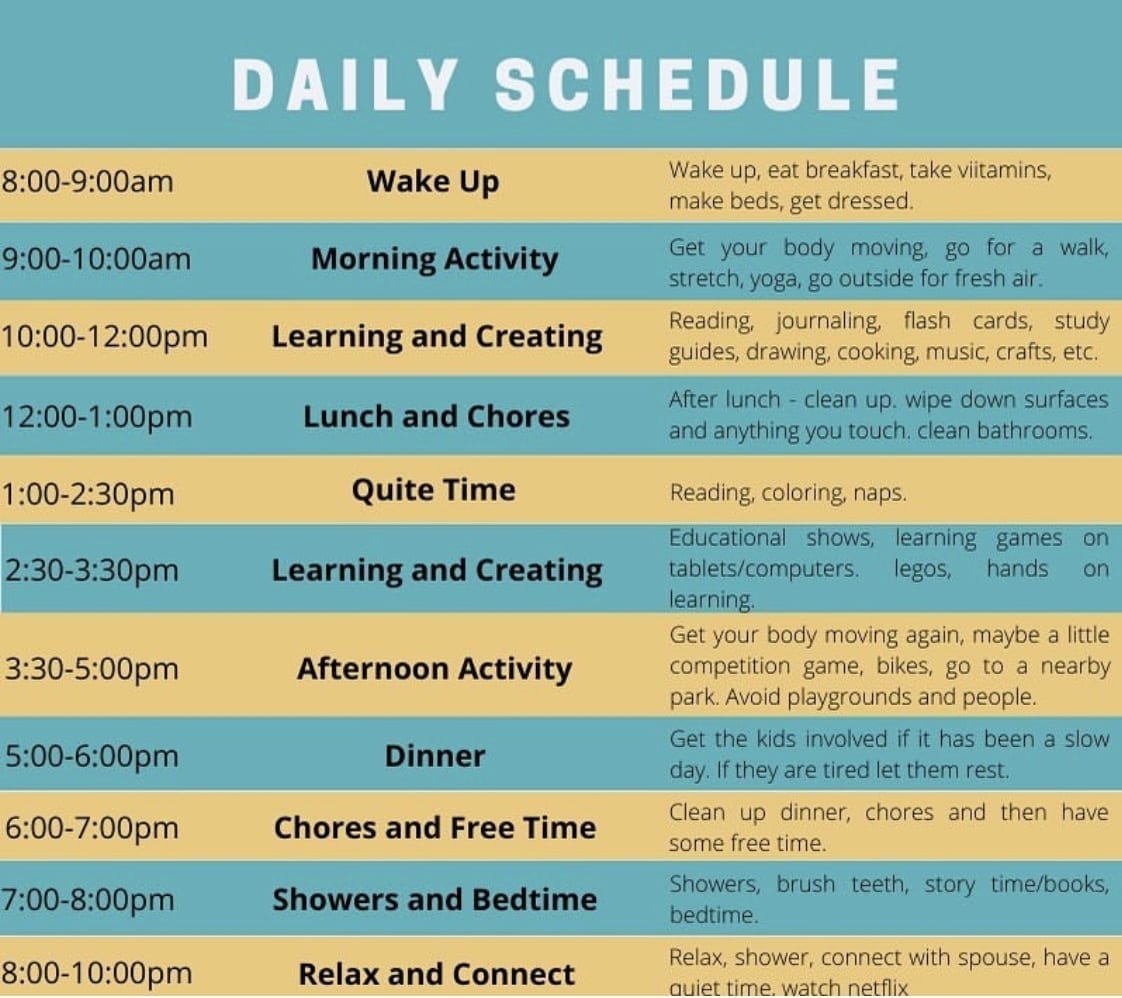 - Create a daily schedule. A day by day list of activities and timing of those activities. You do this with your work calendar so now make a family one with all family members showing when and where they will perform certain activities. What if you have only one PC for your 4 kids to share? Assign them time slots. What if both you and your spouse have conference calls at the same time and you also have kids at home? Put both those times and most importantly the locations for these calls on the schedule and assign activities such as school work for the kids. I would use a dry erase board, electronic calendar or chalkboard that ALL parties can access so there is no confusion. Below is a sample schedule one family is using – I would take it one step further and put the locations of each activity in case your space is limited like mine: